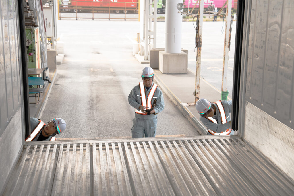 コンテナコンディションチェック、チェック後の受付、また、ヤード内の大型機器を対象とした誘導を行っています。